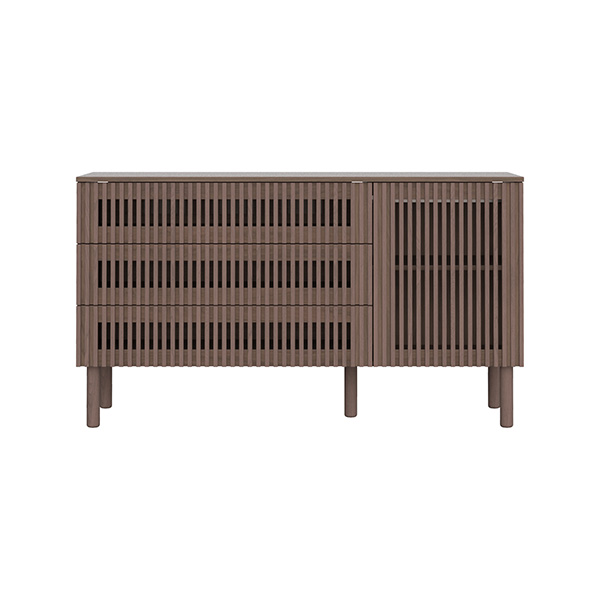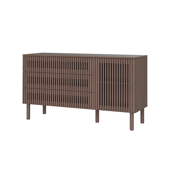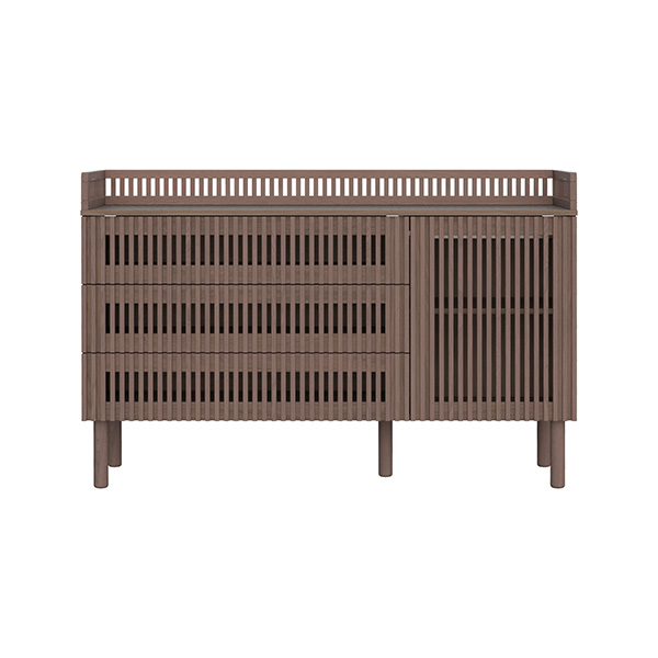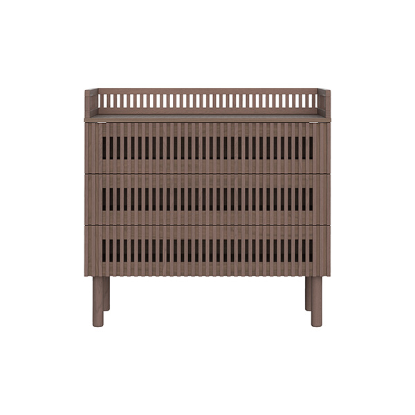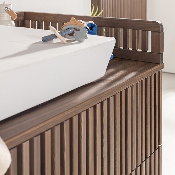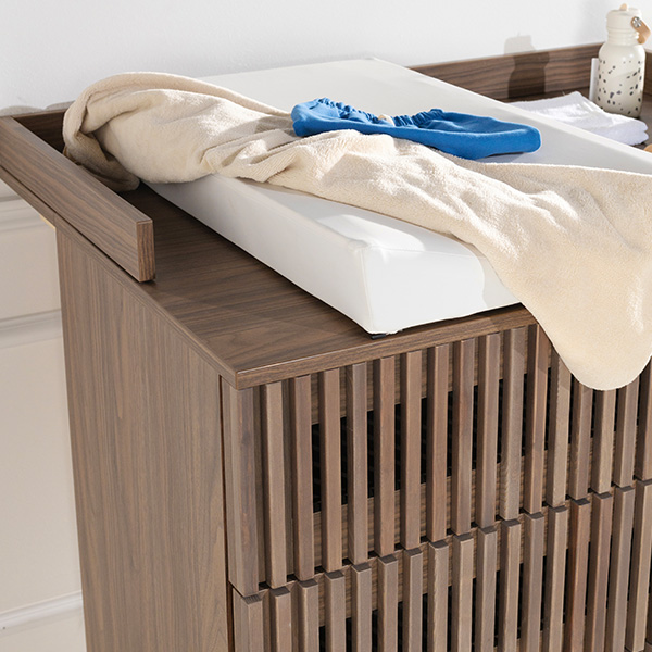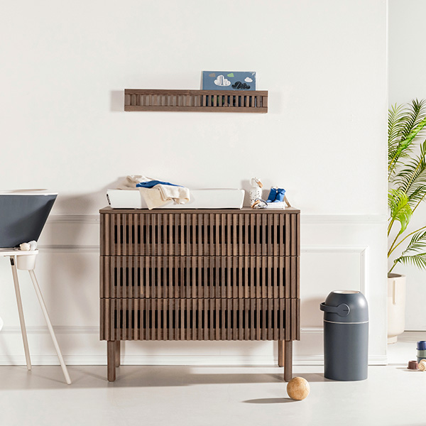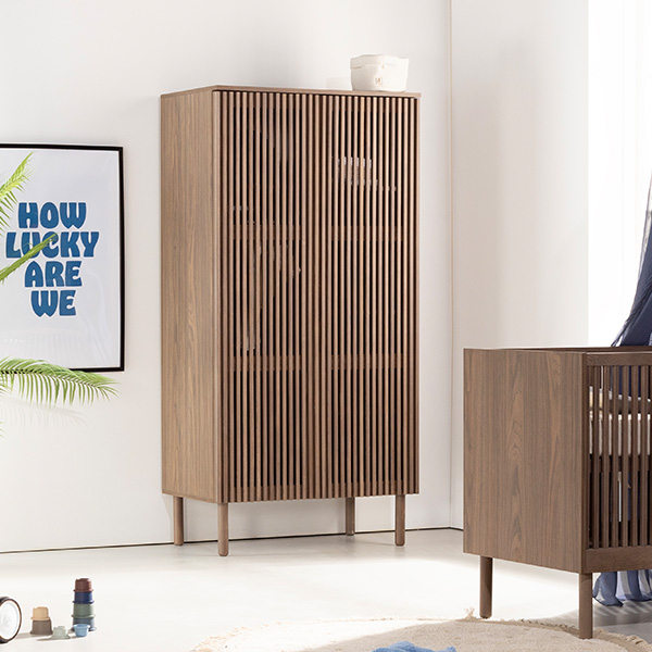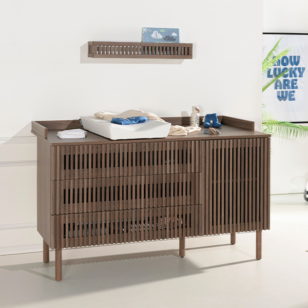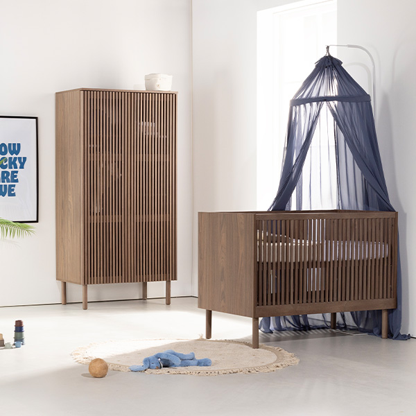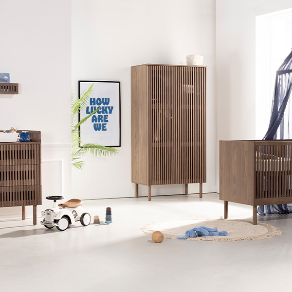 De Dai walnoot babykamer combineert een stijlvolle en minimalistische stijl. De meubels zijn vervaardigd van 100% grenen en hoogwaardig plaatmateriaal. De commode is verkrijgbaar met 3 laden en als XL uitvoering. Voor beide uitvoeringen van de commode is een bladvergroter en een design kuif beschikbaar. Zowel de Dai commode als kast bieden voldoende opbergruimte, en het ledikant is verstelbaar in drie verschillende hoogtes en er is een juniorzijde verkrijgbaar waardoor je kindje (wanneer het oud genoeg is) zelfstandig en veilig uit het ledikantje kan klimmen. Het latwerk en de warme walnoot kleur zorgen voor een moderne en luxe uitstraling. De deuren en lades zijn uitgerust met een push-to-open en soft-close systeem.