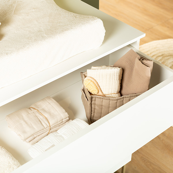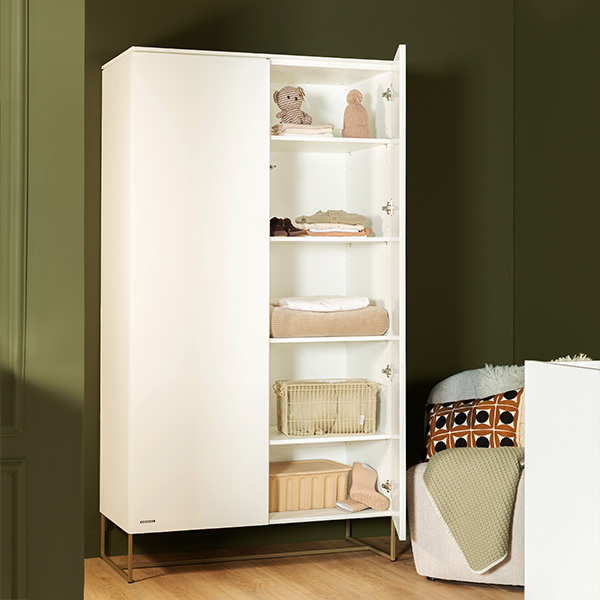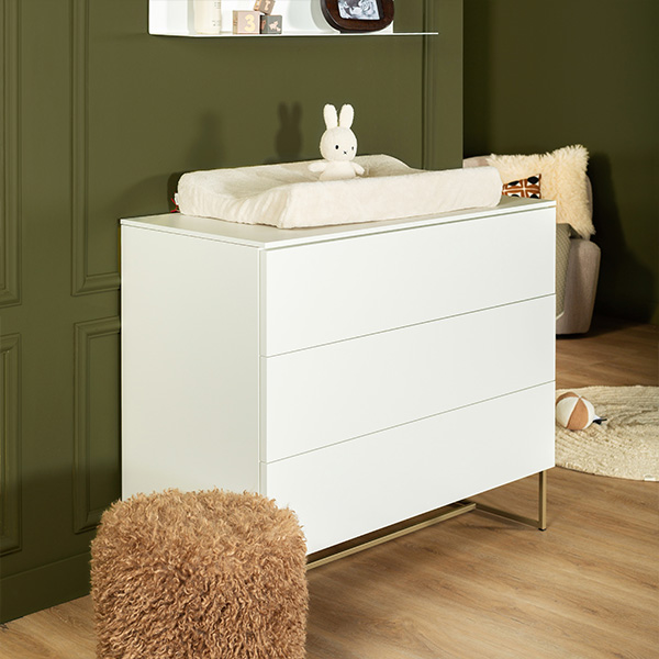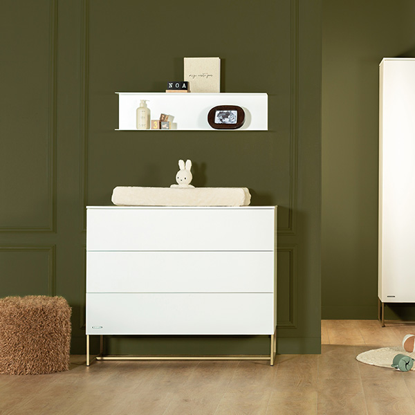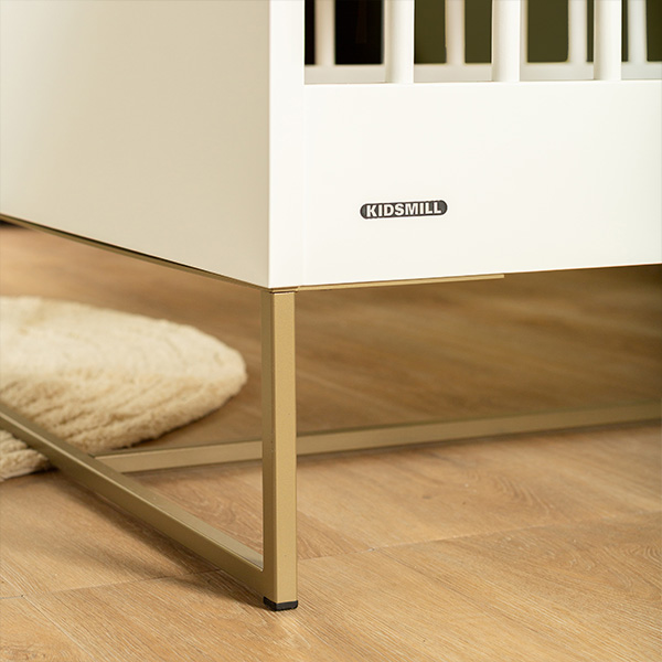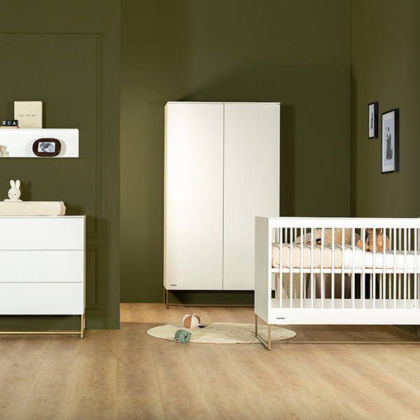 Richt de babykamer van je kindje in met de meubels van Kidsmill Intense II Babykamer, waarbij je de keuze hebt uit verschillende onderstellen, zoals patinated brass of zwart metaal, eikenhout of walnoot hout. De commode is verkrijgbaar in drie varianten met verschillende lades en deuren, en kan gemakkelijk aan de muur worden bevestigd met het meegeleverde hangbeslag. Personaliseer verder de bladen van de commode en kledingkast, met opties zoals wit, marmer taupe, marmer sand, marmer zwart, eiken of walnoot voor een unieke uitstraling.