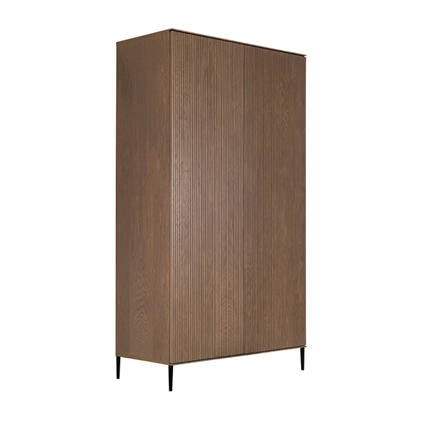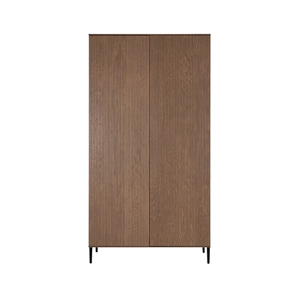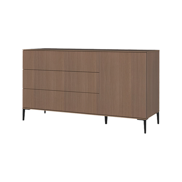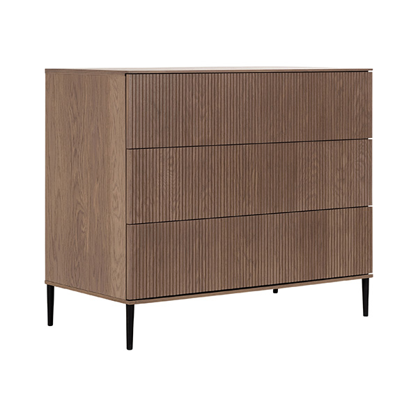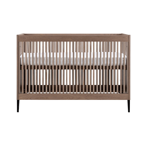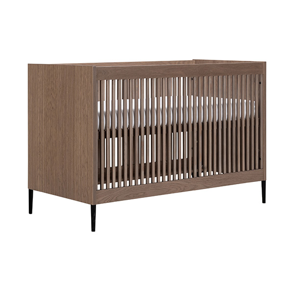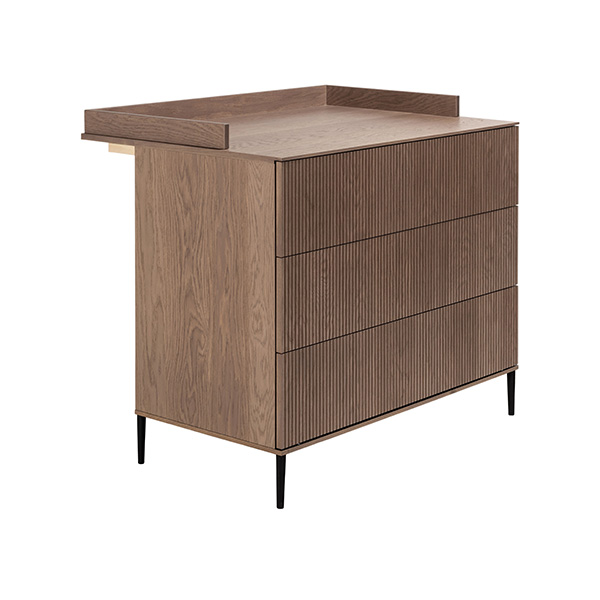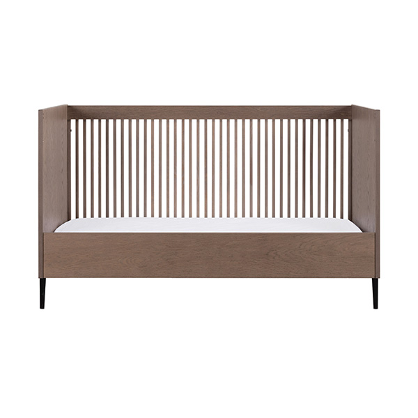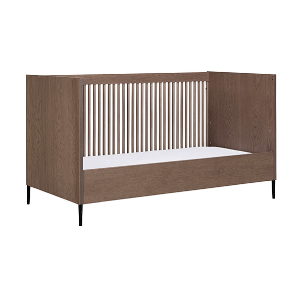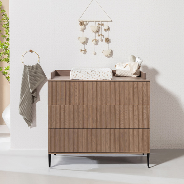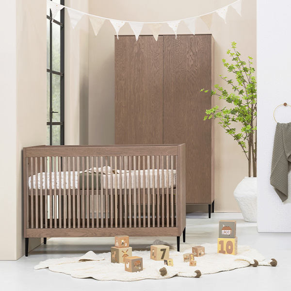De babykamer Levi walnoot incl. ronde poten met een bed van 60 x 120 cm of 70 x 140 cm, commode (XL) en kast combineert een landelijke en strakke stijl. De meubels zijn vervaardigd van hoogwaardig MDF en plaatmateriaal, afgewerkt met een echte eiken fineerlaag. Zowel de Levi commode als kast bieden voldoende opbergruimte, en het ledikant is verstelbaar in drie verschillende hoogtes. De verfijnde groeven in de fronten en de metalen zwarte pootjes geven de meubels een moderne uitstraling, terwijl de deuren en lades zijn uitgerust met een push-to-open en soft-close systeem.